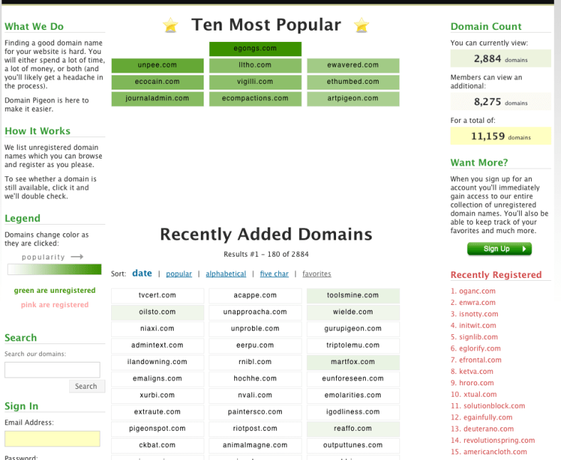 - Removed Top 10 Domains. Simply put, they weren’t going anywhere. Unpee.com had been in the Top 10 for the past two days probably more because it was funny than because it was a good domain name. The Top 10 was important when the site wasn’t getting much traffic because it was a quick overview of what other visitors were doing and it was colorful, but now that the coloring algorithm has been adjusted and the site is getting more traffic, its not as important. Also, the two inches of white space below that section (which kept the dropdowns smooth), no longer has to be there. That’s valuable real estate and it was being wasted.