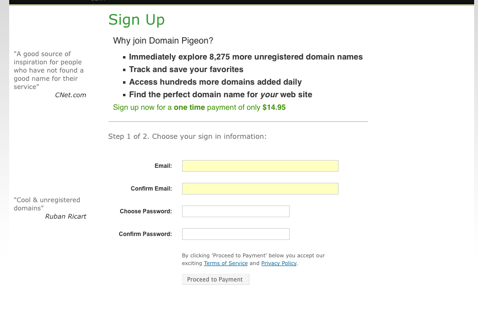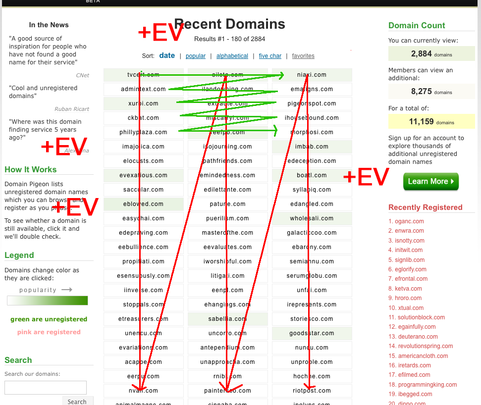 - Added In the News. Domain Pigeon has received a bit of attention the last several days and I’m seizing the opportunity to promote the site (+EV). CNet is at the top, as it is the the source with the most name recognition. After that is a short quote from Ruban Ricart of Frusketing.com and Alex Pina via Twitter. I considered putting “Frusketing” instead of Ruban Ricart and “Twitter” instead of Alex Pina, but it seemed dishonest to imply that Twitter, the company, had made the comment. I didn’t include Frusketing because it looks too much like Frustrating which is opposite of the impression (similar to omitting the word “headache”). Ryan’s article was kind of hard to pull a good quote directly from so I started off by doing some clever parsing (like “Domain Pigeon [..] is a [..] great site”), but it also seemed too dishonest (-EV) so I just went with something short and sweet.