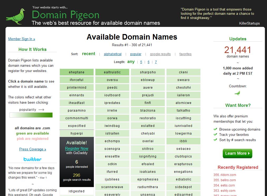 - Paid accounts are back, but with a twist. Originally accounts enabled people to see more domain names than casual visitors. I did away with that about two weeks ago so that I could make the domains available to everybody. I realized that there are a few features that heavy users might find useful, which is who these accounts are for. Those features are currently: 1) The ability to sort by the number of Google results, 2) Track your favorites, 3) See the domains scheduled for the next release