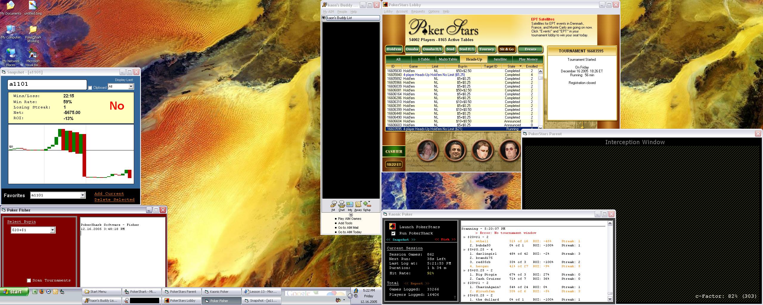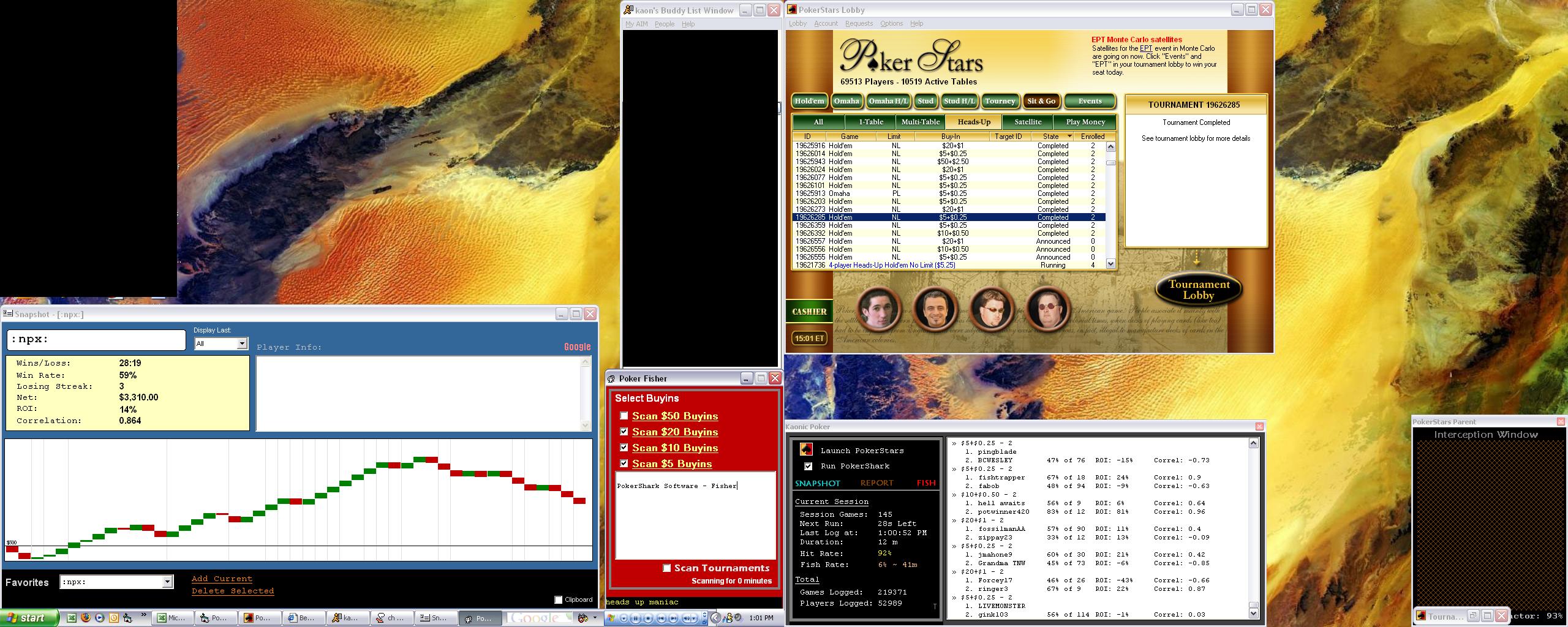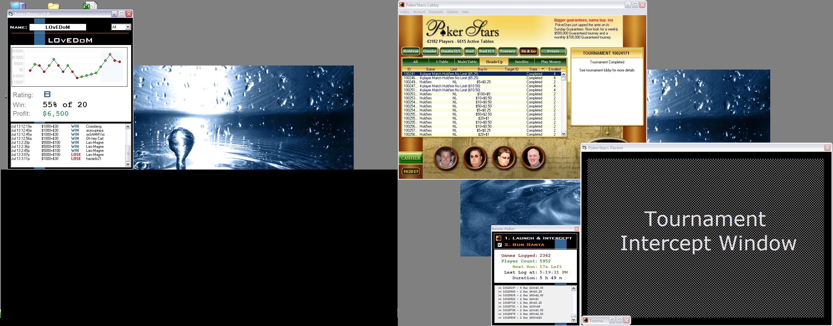 The small, busy window below the PokerStars lobby displayed collection statistics and the large “Tournament Intercept Window” intercepted the Completed tournament windows as they were opened so it didn’t steal the focus away from anything else I was doing.
