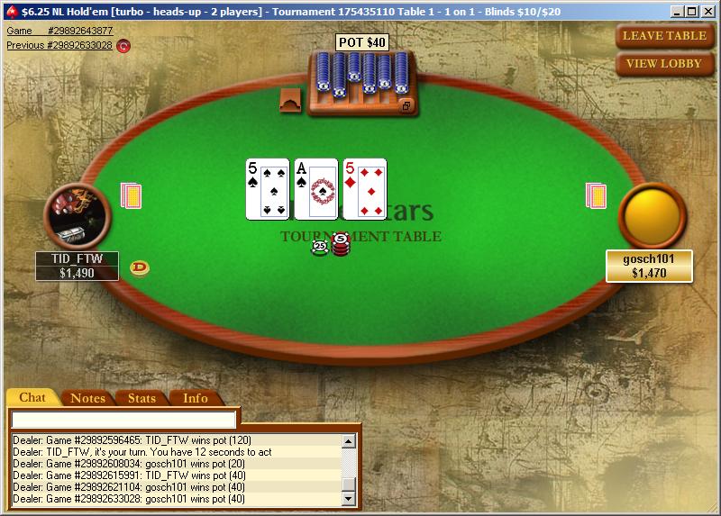 Some background: When I started playing online poker in early 2005 I was immediately drawn to one vs one No Limit Hold’em tournaments, known as Heads Up Sit-n-Go’s (HUSNGs). They’re fast, exciting, and they require an increased attention to psychology that you don’t get as much of at the full ring (9 players) tables.