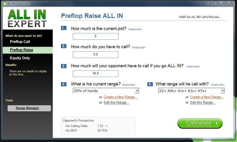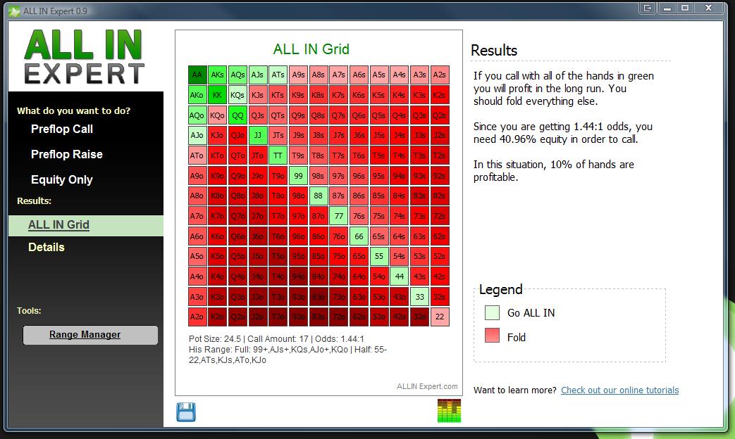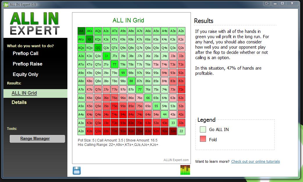 There is an awesome program called “poker stove” that I went over how to use in this video. However, there is another awesome program called “All-In Expert” that has made it very easy to figure out not only your exact range of shoving/calling (given factors like stack sizes, opening ranges, calling ranges, etc), but also the exact profitability of each hand.