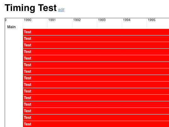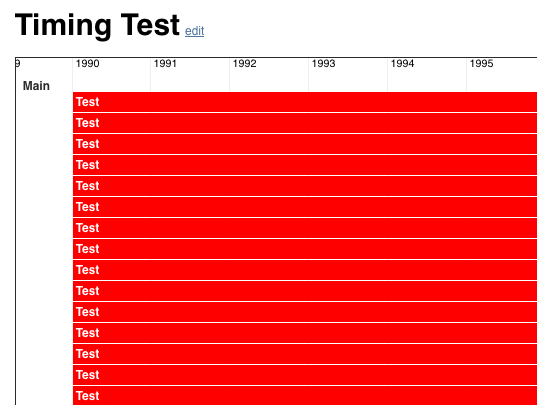 To do this, I created a timeline on my local machine and used the Rails console to add 50 events to it. I loaded it a few times and checked the server logs, which indicated that it took about 15 seconds to load on average. Eesh.