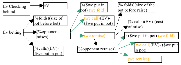 EV trees and determining action. We will take the action with the highest EV. The function for EV of an action is the probability each result of that action will take place times the total EV resulting from that action taking place. This has a branching effect,  as in order to determine the EV of immediate possibilities we have to break it down into each later possibility, and this creates a nearly limitless function tree. Because this will be too complex for us to carry out in real time over all streets (trying to calculate the EV of each possible outcome for each possible turn and river card would be too resource intensive), we will always estimate explicitly all of the flop actions, and then use an estimator function for all turn and river possibilities for each ending branch of the whole flop action tree.