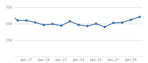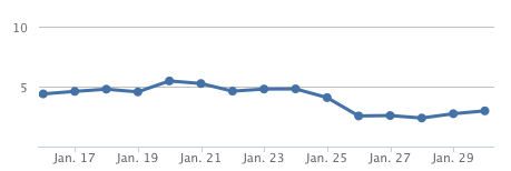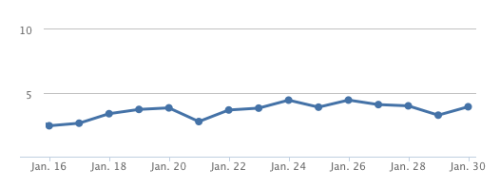 And this makes sense — launch day (Jan 16) had a lot of folks just checking it out so you’d expect the number of searches to be lower. As the ooh-shiny-thing traffic fades off, the people who are left are the ones who are actually using the tool for its intended purpose. Currently, the average number of searches per user is hovering at around 4.