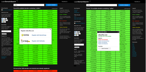 - The “Add to favorites” icon (which used to be a plus sign you’d see when hovering over a domain) is now in the registration options box — I did this because opening the registration options box now automatically triggers a “double-check” feature which confirms the availability of the domain name you clicked on and I don’t want users adding domains to their favorites that are actually registered