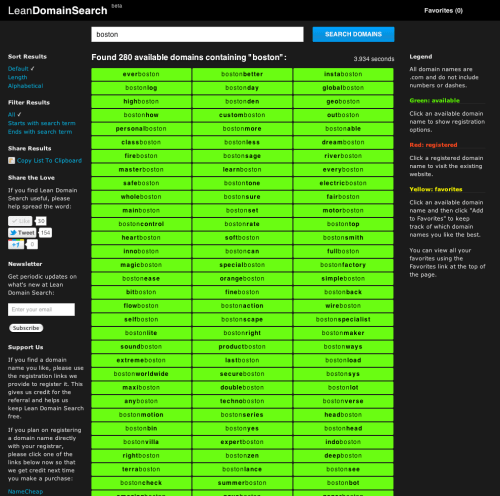 Lean Domain Search is the result. It’s better that what I originally envisioned: it generates and checks the availability of 1,000 domain names in about 2 to 3 seconds (go check it out!).