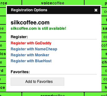 4. It seems like you’re going backwards on registration box. You’ve completely removed the option to add to favorites from the box (In fact after a 5 second glance of your site I can’t figure out how to do it at all). I use a ‘save temporarily’ feature like this whenever I am in the process of registering a domain. You’ve got GoDaddy as your default, even though one of your main audiences is HN people specifically and hackers in general, who will likely still not be fond of GoDaddy and want to use a different registrar, at least for the near future until SOPA is a bit less fresh.