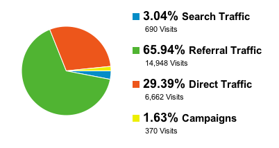 • 66% of the traffic was from referral links: those two HackerNews posts, a FeeFighters blog post about finding a domain name for your startup, social media, a few misc blog posts, and a few mentions on marketing forums.