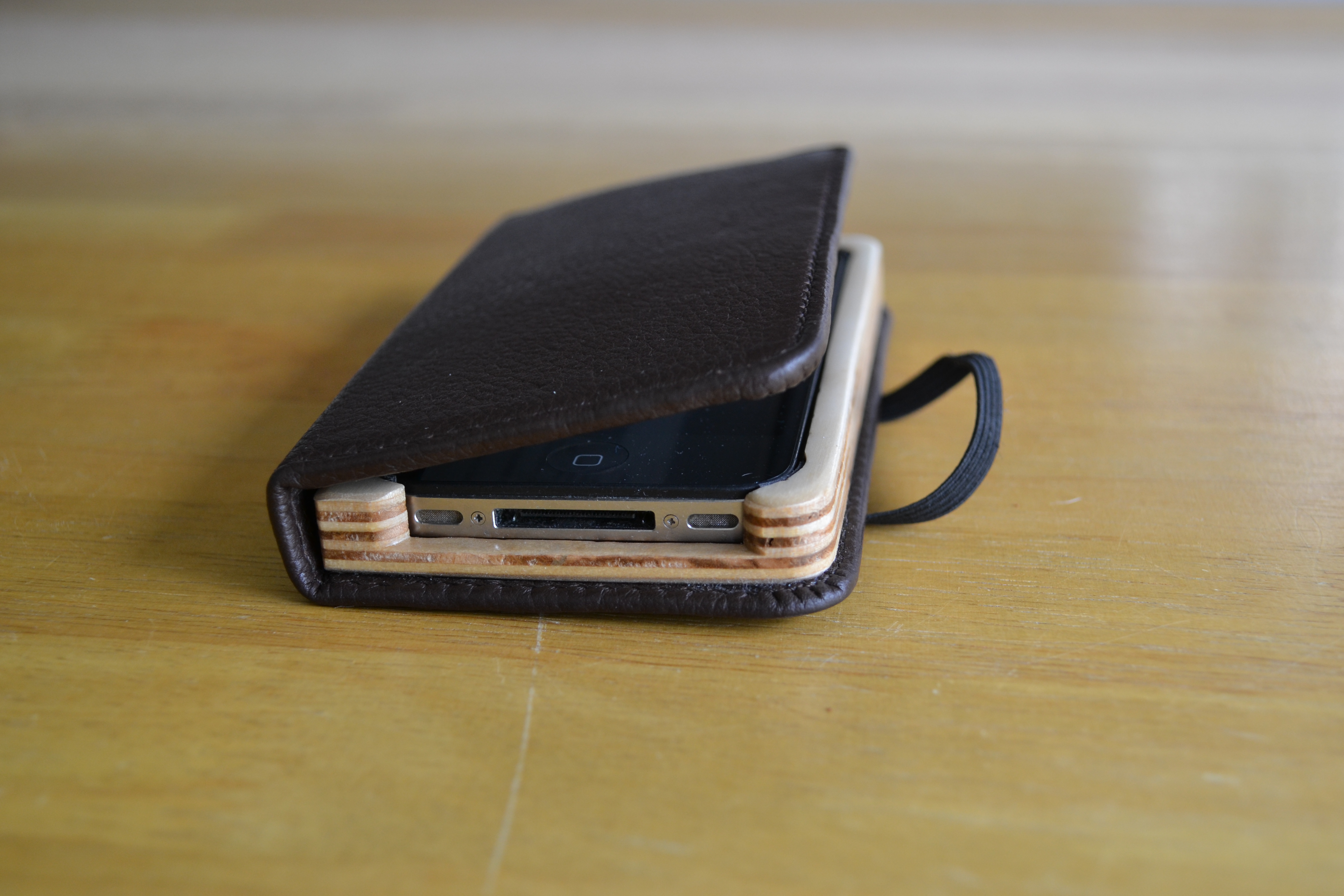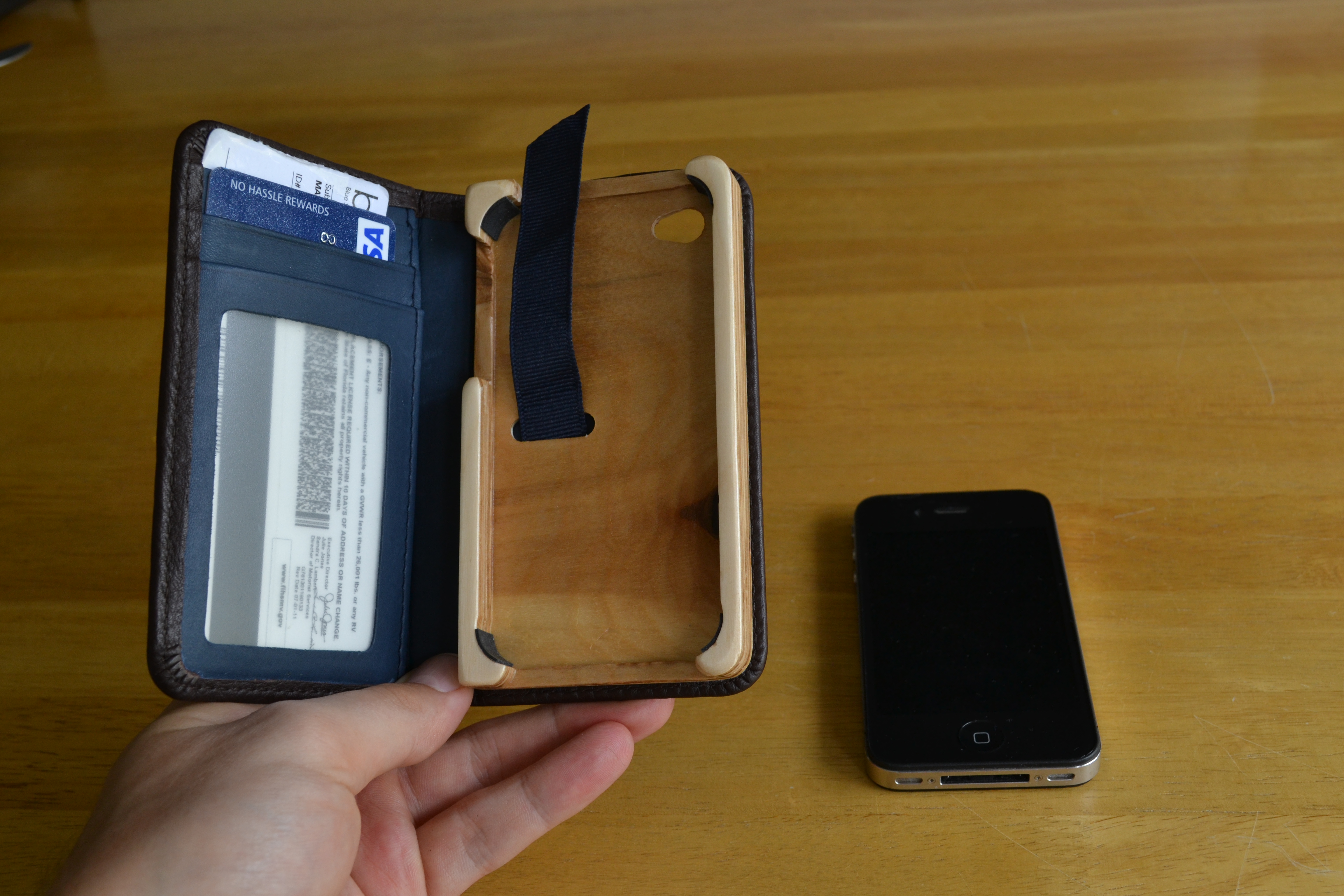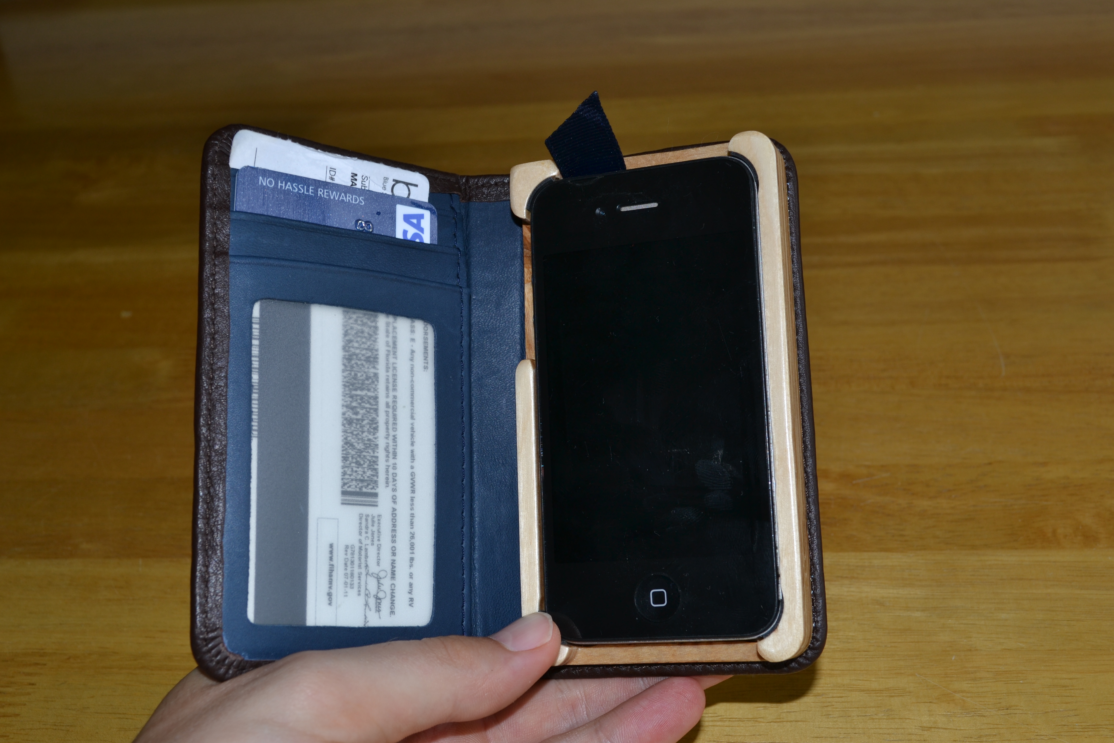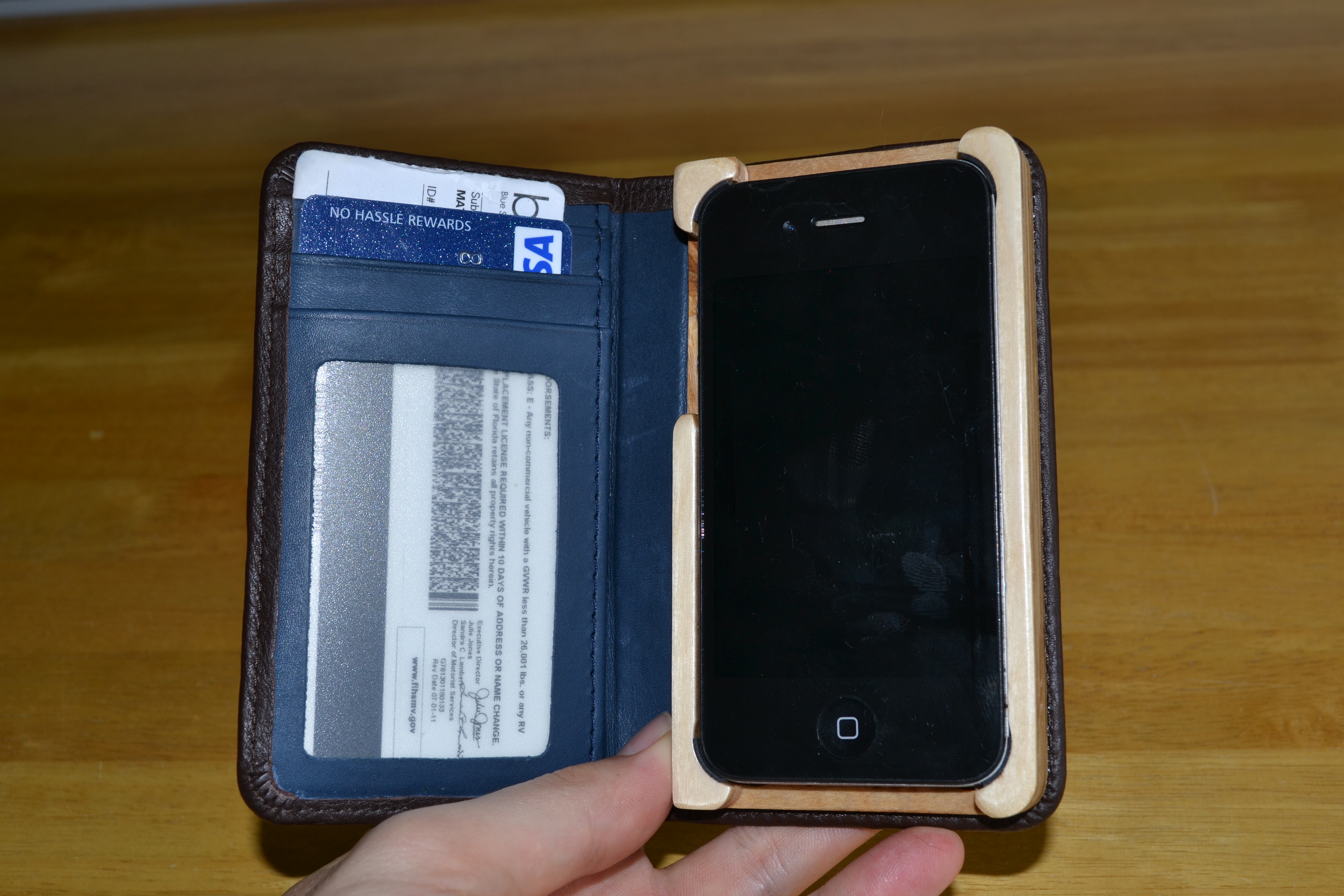 The left side of the case has three slots plus one behind it for additional storage space. The right side of the case is made of baltic birch plywood which holds your iPhone in place.