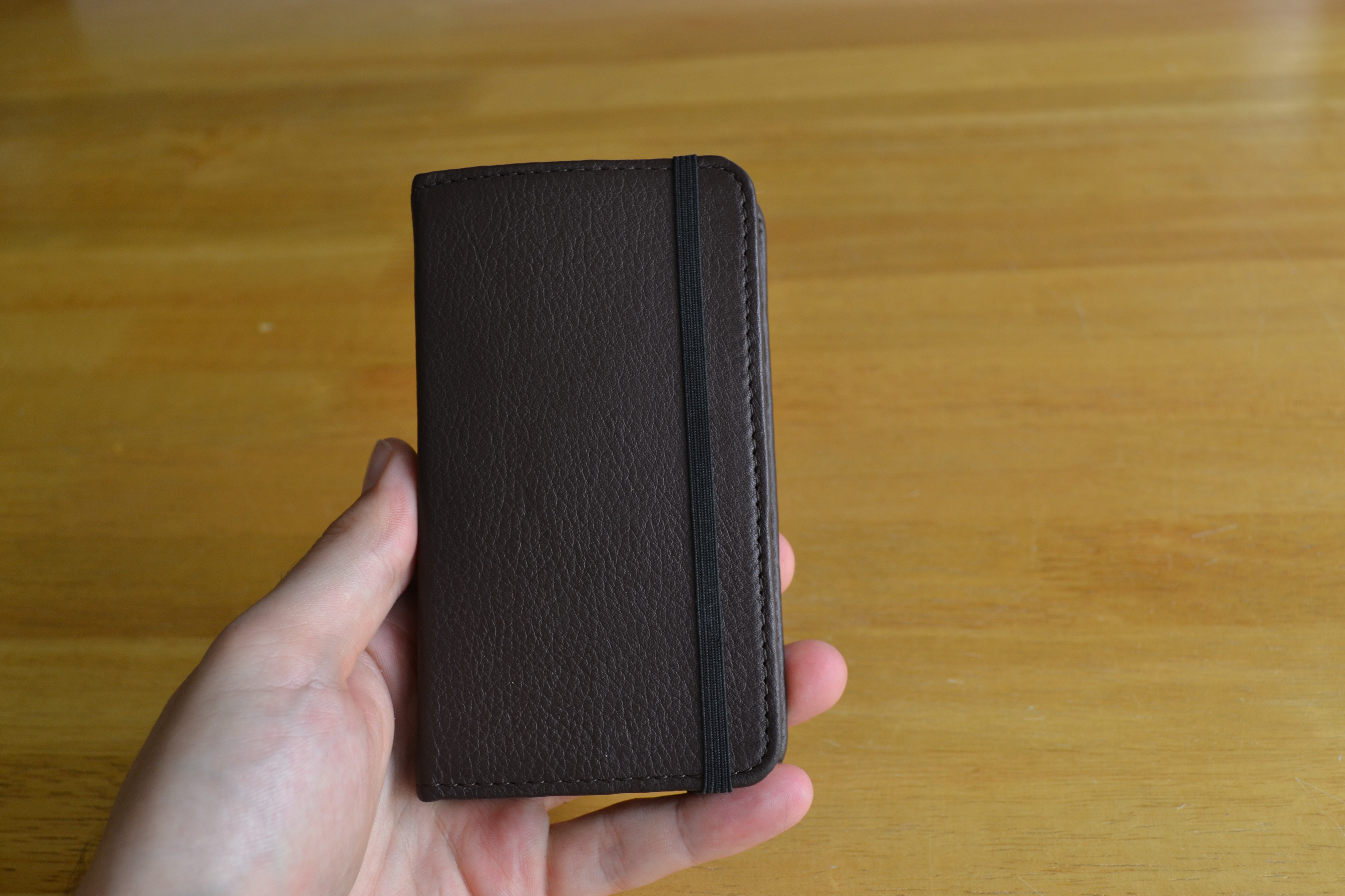 One of the major adjustments for me was that you can’t carry around the same number of things that you would in a normal wallet. I had to get rid of all of the non-essentials so that now I just carry around my insurance card, my credit card, my driver’s license, and a small amount of cash. Even with just those items, the front cover does not sit flat without the strap to keep it tightly bound together: