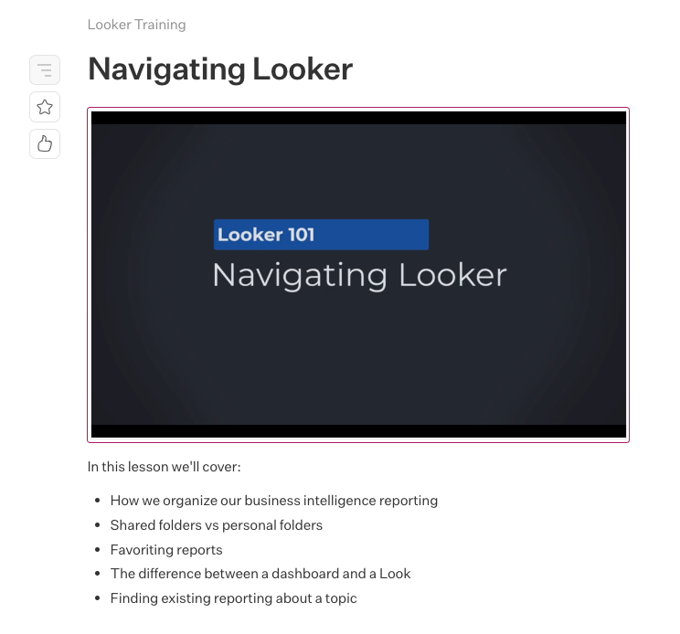 This week had me figuring out how to use Camtasia and Wistia to record and share the first video about navigating Looker, which I then embedded in Slab, the knowledge base tool Help Scout uses internally. Here’s what the video winds up looking like in Slab: