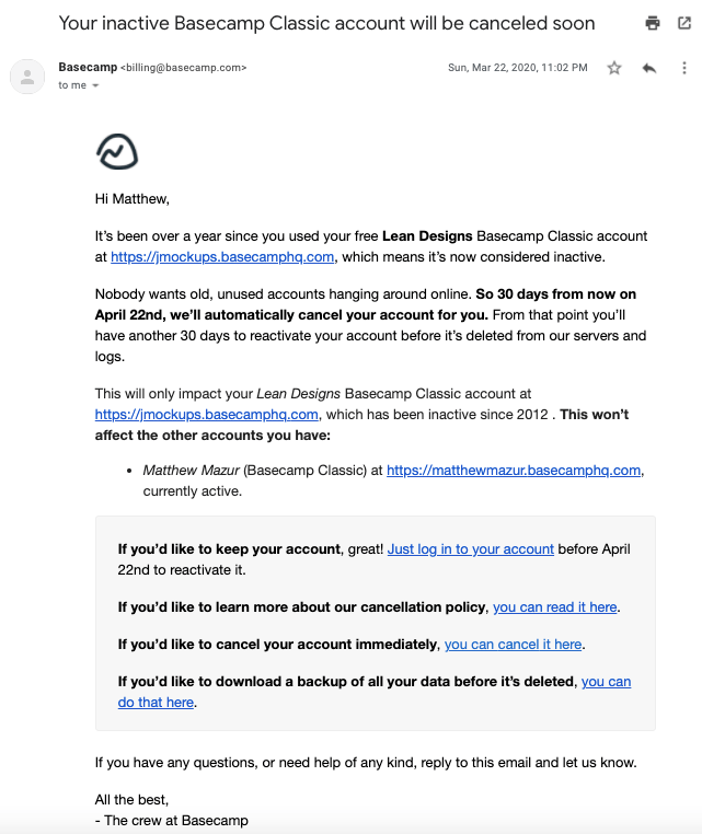 This email was inspired by a similar email that Basecamp sends to inactive users: