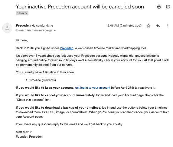 As part of this ongoing data retention project, I’ve reached the stage where I’m handling inactive users who do have a meaningful amount of content in Preceden and therefore need to be notified and given some time so they can log back in and prevent their account from being deleted.