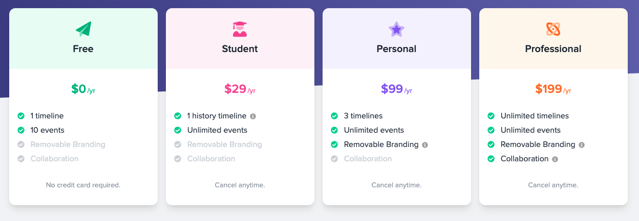 There are plenty of people who use Preceden for work who only need one historical timeline, so the Student plan has been fine for them functionality wise in the past. Hopefully this branding will nudge some of them over to the Personal plan in the future, driving additional revenue.