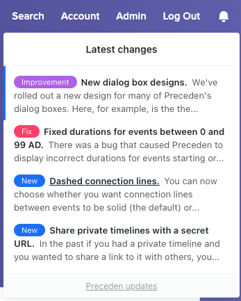 In addition to being able to read them directly in the app, Headway generates a public page where anyone can follow the changes. I also hooked Headway up to Preceden’s long-neglected Twitter account where it shares updates when I publish them:
