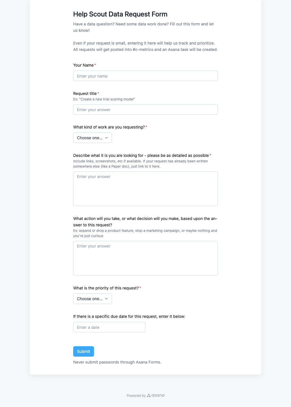 Michael, the new data lead who joined in May, set up a data request intake form which has gone a long way towards organizing our day-to-day data work at Help Scout. Here’s the current version: