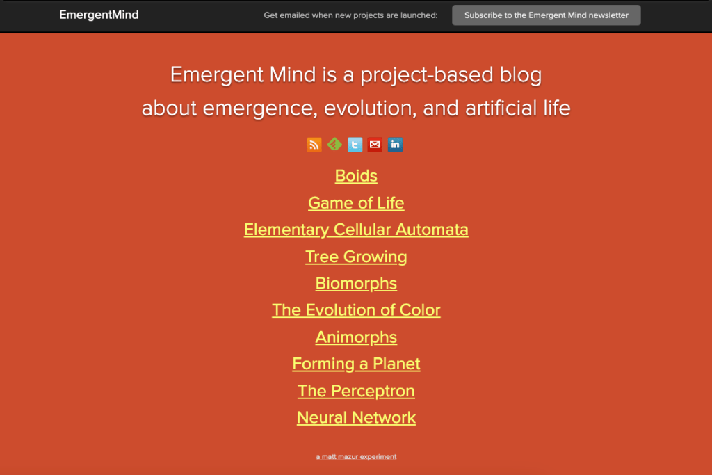 Around 2014 I got very interested in the concept of emergence and created a site called Emergent Mind to build little projects to explore the space more. In the end I wound up creating 10 interactive visualizations: Boids, Game of Life, Cellular Automata, Tree Growing, Biomorophs, The Evolution of Color, Animorphs, Forming a Planet, The Perceptron, and Neural Network.