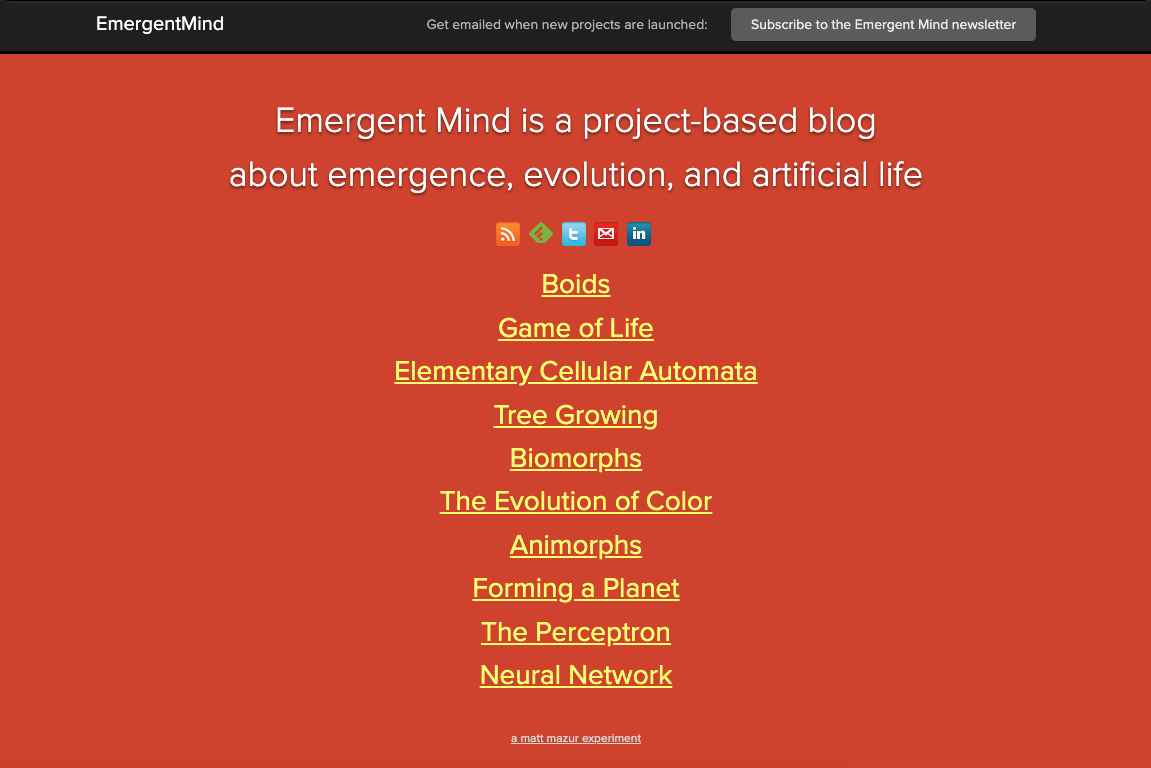 Around 2014 I got very interested in the concept of emergence and created a site called Emergent Mind to build little projects to explore the space more. In the end I wound up creating 10 interactive visualizations: Boids, Game of Life, Cellular Automata, Tree Growing, Biomorophs, The Evolution of Color, Animorphs, Forming a Planet, The Perceptron, and Neural Network.