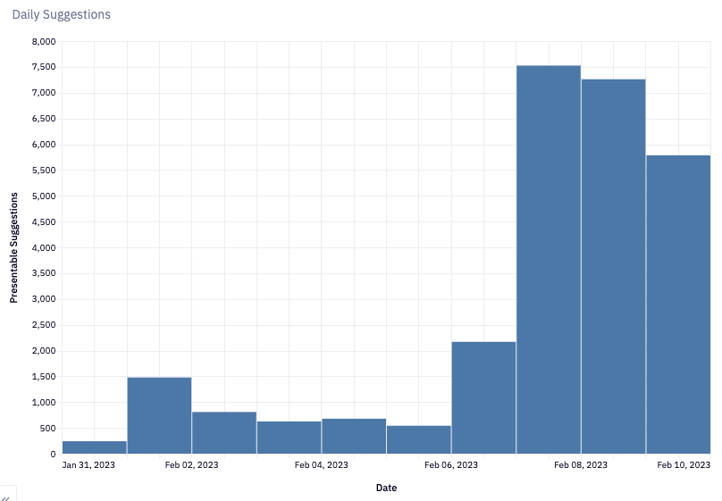 I also took some time this week to set up an internal dashboard (in Hex via dbt and Stitch) so monitor usage of the AI Suggestions tool. Here, for example, are the # of suggestions it came up with by day: