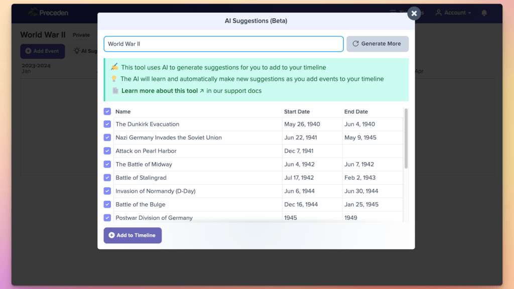 In January I launched an AI Suggestions feature to help users automatically add content to their timelines instead of having to manually build it entirely from scratch. Milan (the part-time designer I work with for both Preceden and Emergent Mind) and I iterated on it a ton in January and February and I’m quite happy with where it wound up.