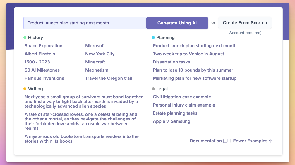 Here are the example topics to give you an idea of what people are using Preceden for, and what this tool has to handle: