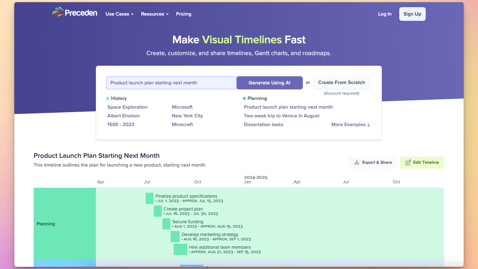 About two weeks ago I quietly launched a major update to Preceden: the ability to generate complete timelines on any topic using AI, directly from the homepage, no account required: