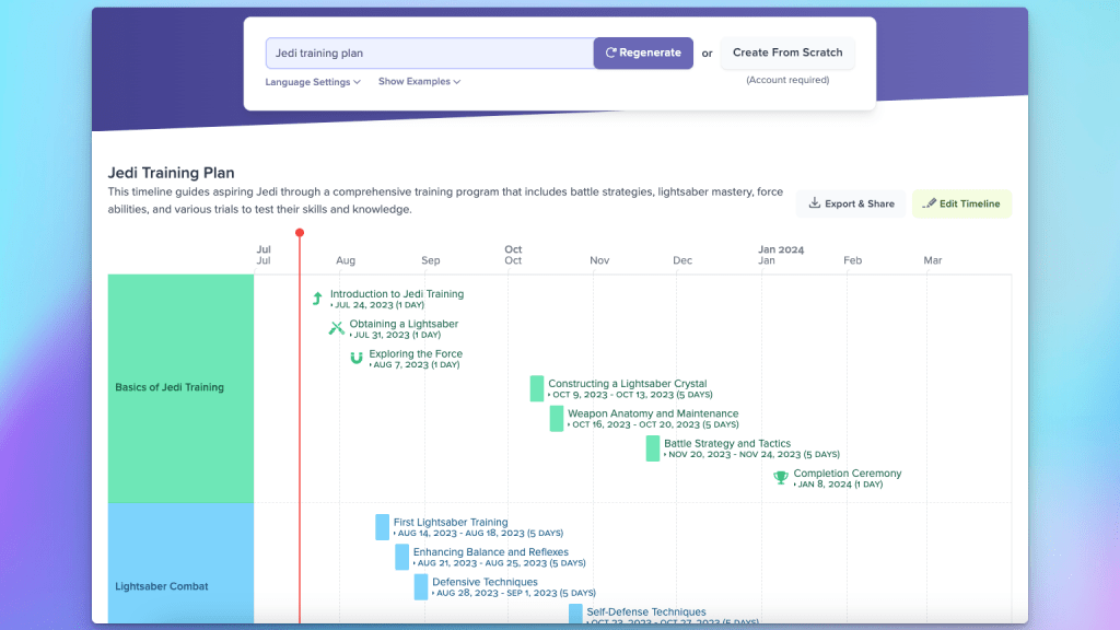 To my surprise, many users also type or paste in long, complex project descriptions, hoping to generate a timeline that reflects all of the details in their description. For example, the timeline above was generated using the following description that begins with: