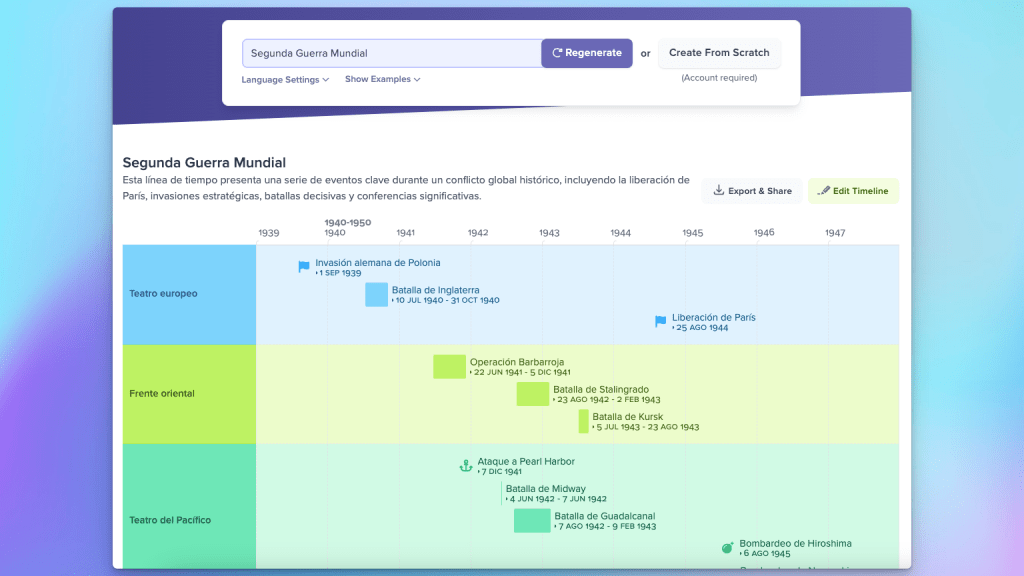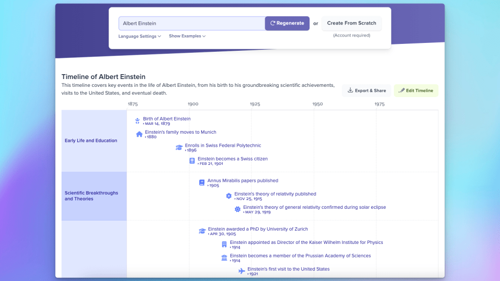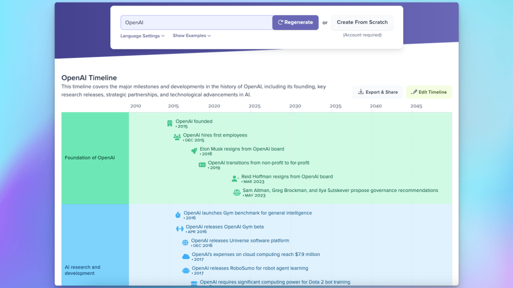 At a high level, this new AI-powered timeline maker is taking the topic you provide it, asking ChatGPT for information about it, and then automatically generating a timeline using that data: