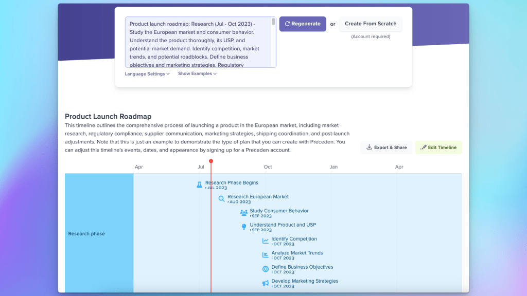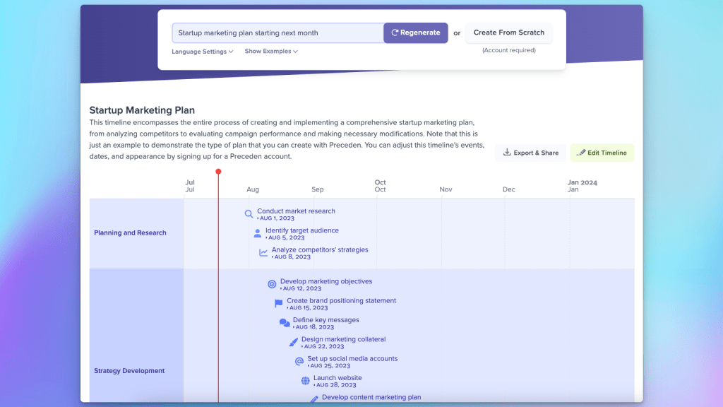 The tool – which is free to use and available on Preceden’s homepage – lets you type in a topic or detailed description of a timeline and it will generate a beautiful visualization for you in less than a minute.