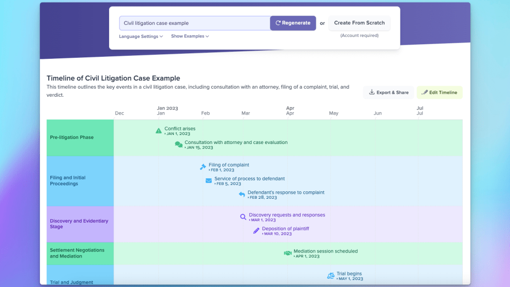 - Legal timelines – for example, a lawyer creating a timeline about the history of a case