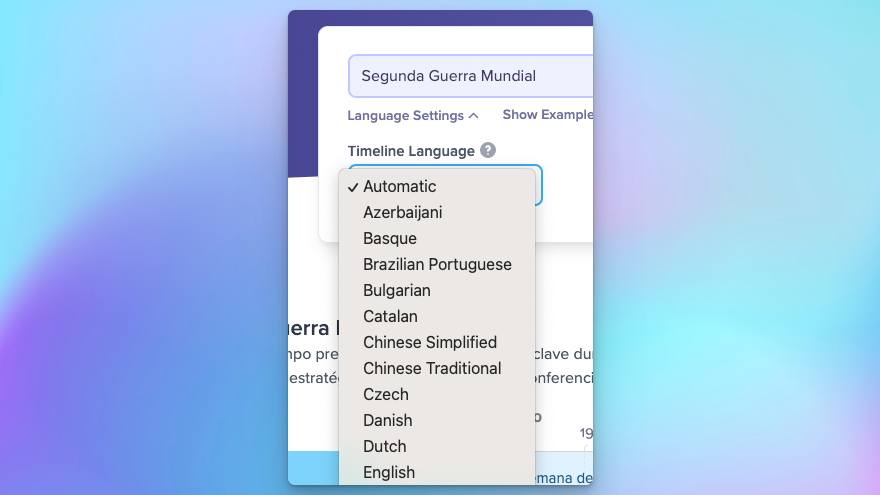 By default, Preceden will detect the language from the topic and generate the timeline in that language, though users can choose a specific language from the language settings: