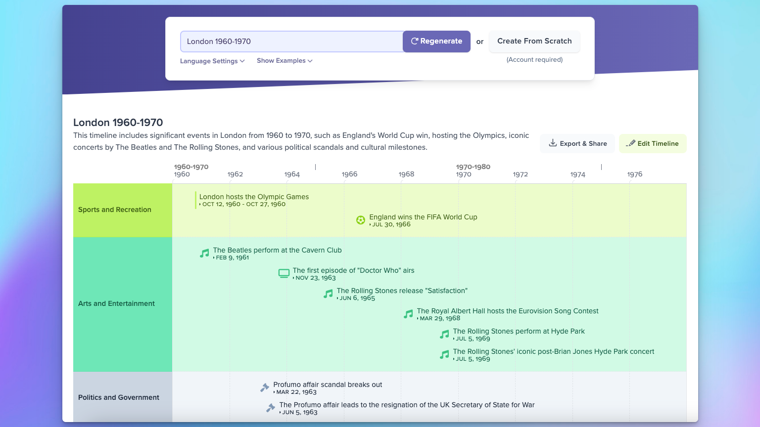 At a high level, this new AI-powered timeline maker is taking the topic you provide it, asking ChatGPT for information about it, and then automatically generating a timeline using that data: