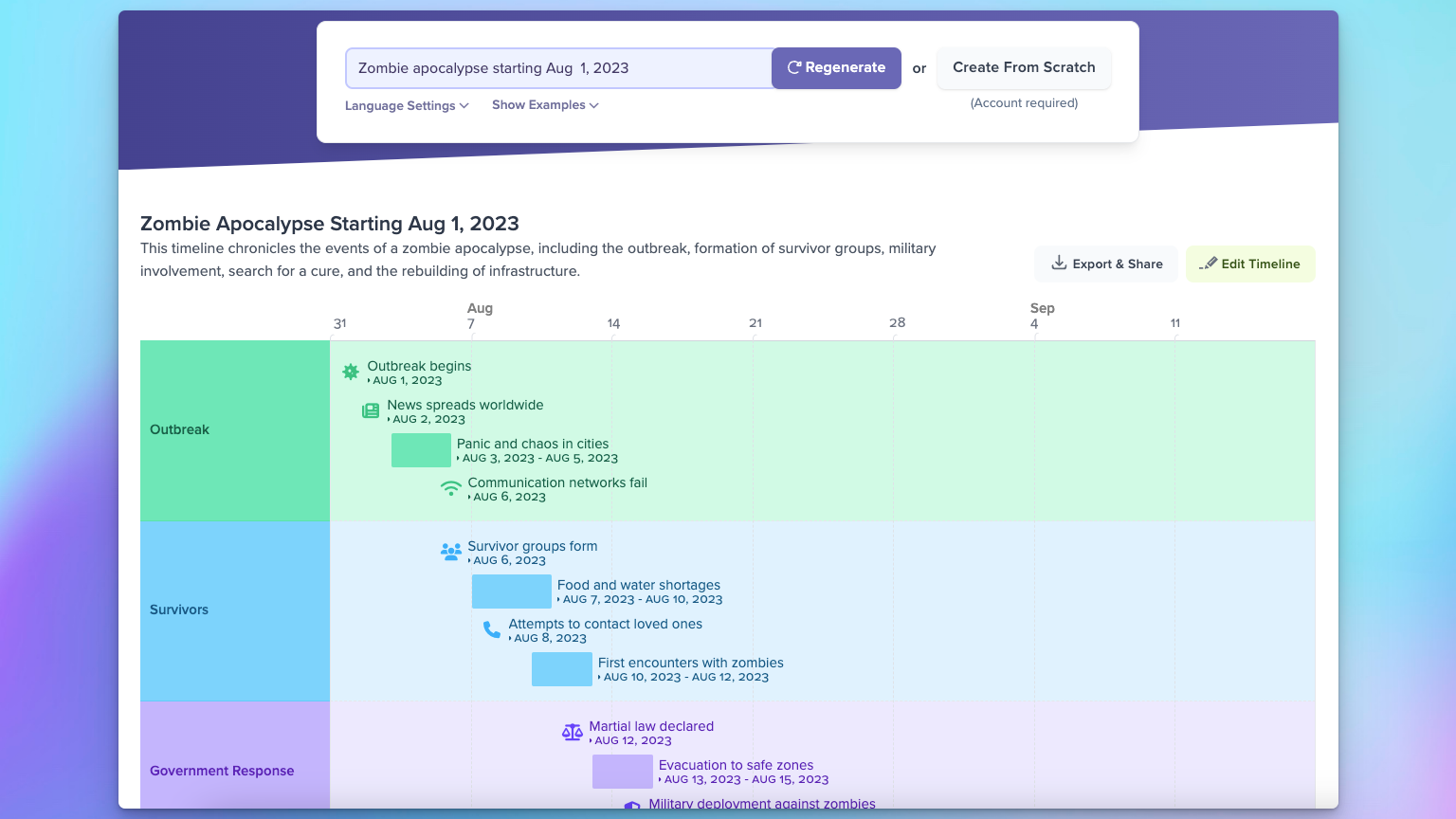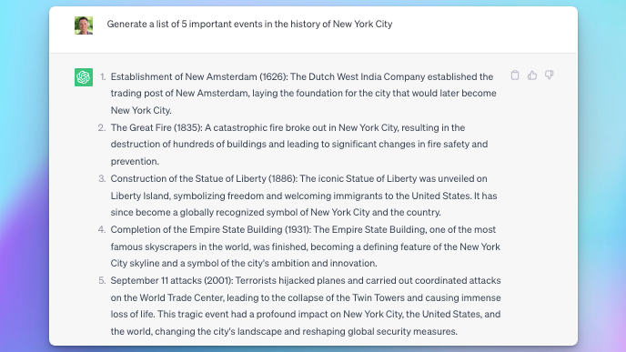 After all, ChatGPT was trained about 570 gigabytes of data sourced from books, Wikipedia, research articles, and much more, so it is aware of many of the topics that people may want to create a timeline about: