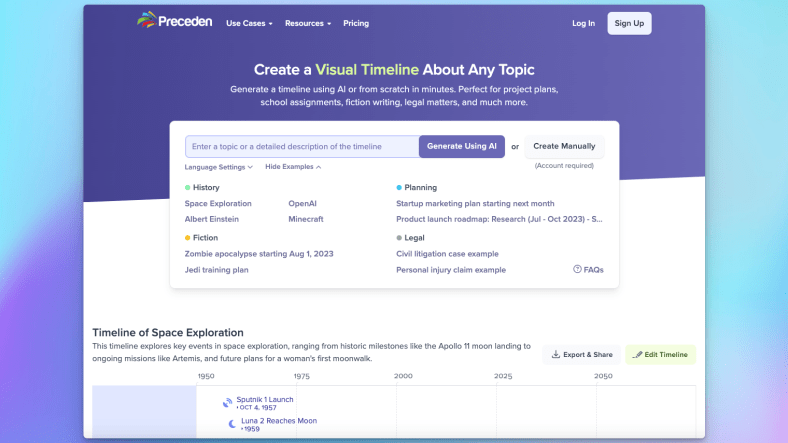 The tool – which is free to use and available on Preceden’s homepage – lets you type in a topic or detailed description of a timeline and it will generate a beautiful visualization for you in less than a minute.