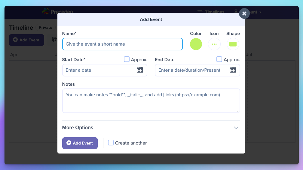 Getting this to work well for for all of the use cases I mentioned earlier, in any language, for hundreds of different date formats, with a seamless and beautifully-designed UI (hat-tip WebPraktikos, Preceden’s designer, for his work there), and without glaring issues (like hallucinating historical events that never actually happened), has been quite a project 🤣.