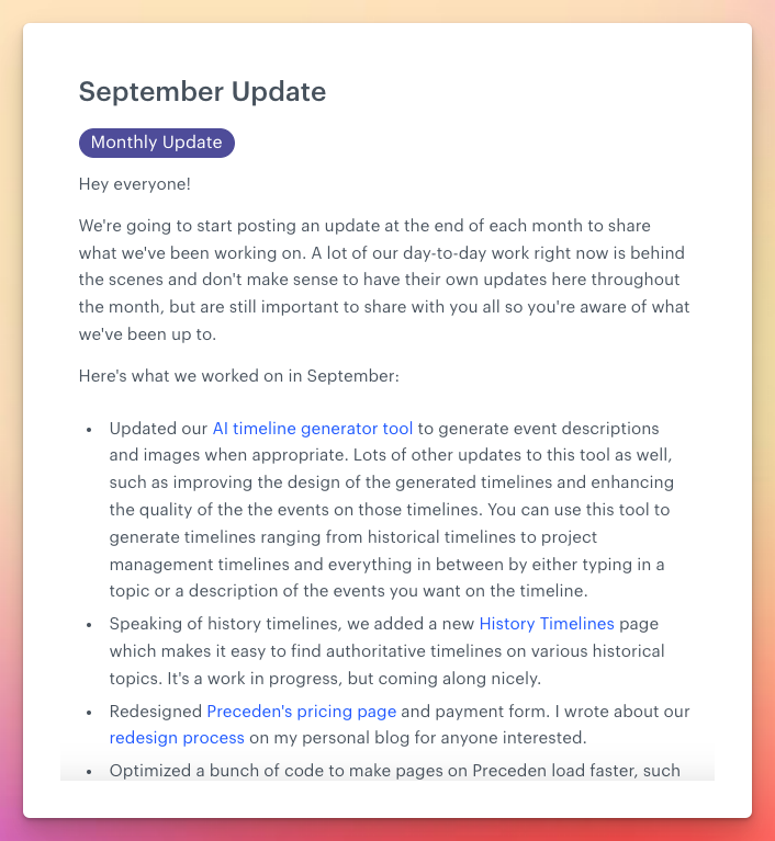 Anyway, to address the immediate problem, going forward on the last weekday of each month I’m going to share an update listing the smaller projects we worked on that month. It doesn’t take much time to write, and I imagine a lot of users will find it interesting, even if the updates don’t necessarilly impact their usage of Preceden.