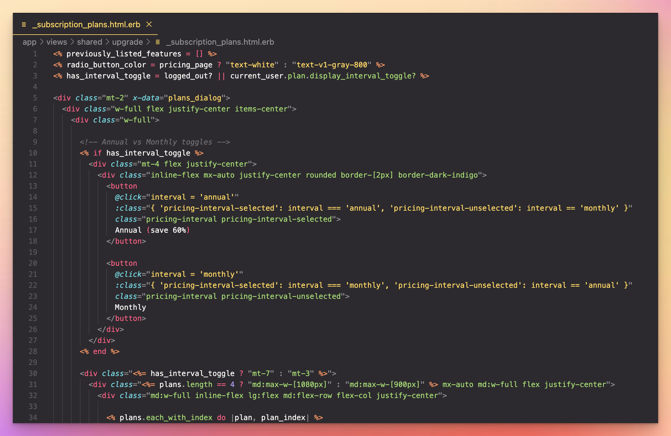 Integrating this into the Rails app took a few more days of work on my end since the pricing page (and in-app upgrade dialog which shares the same design) is dynamically generated based on the user’s current plan, the plans they can upgrade to, the features on those plans, etc:
