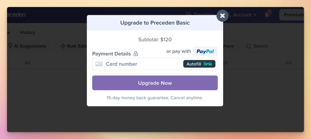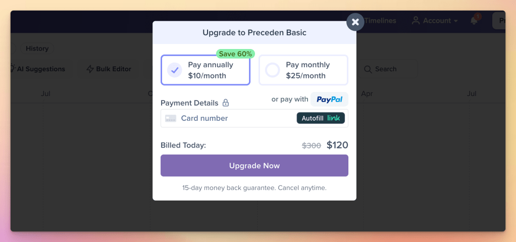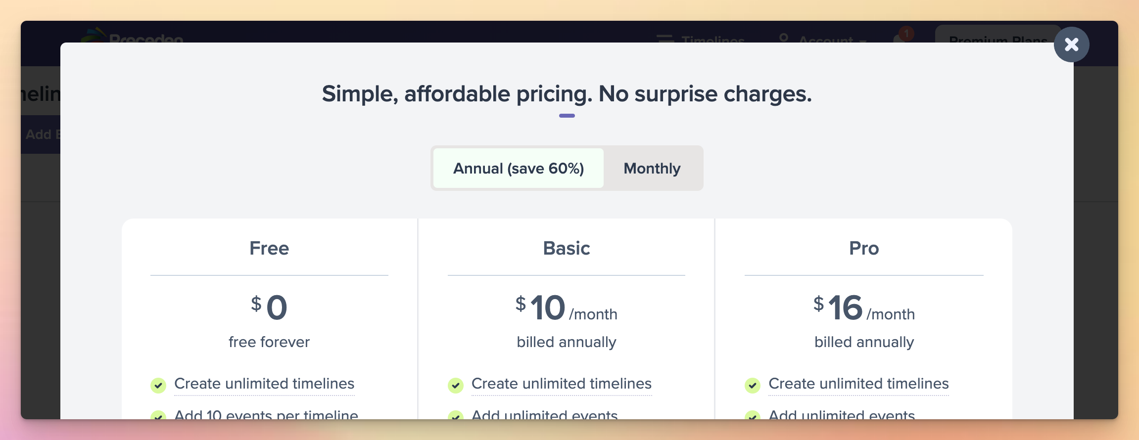 One area for improvement might be for Preceden to display the annual amount in the interval toggle. Currently it displays “$10/month” (consistent with the pricing displayed on the plans in the prior step, and making it easier to understand the savings IMO), whereas with this SaaS, they are displaying the full annual price there ($708/year). I think because Preceden displays the “Billed Today” line with the full annual price below it, the way I’ve done it is fine (also given no refund requests anymore due to accidental annual payments), but I’m also open to changing it if anyone wants to make an argument that displaying “$120/year” there is better than “$10/month”.