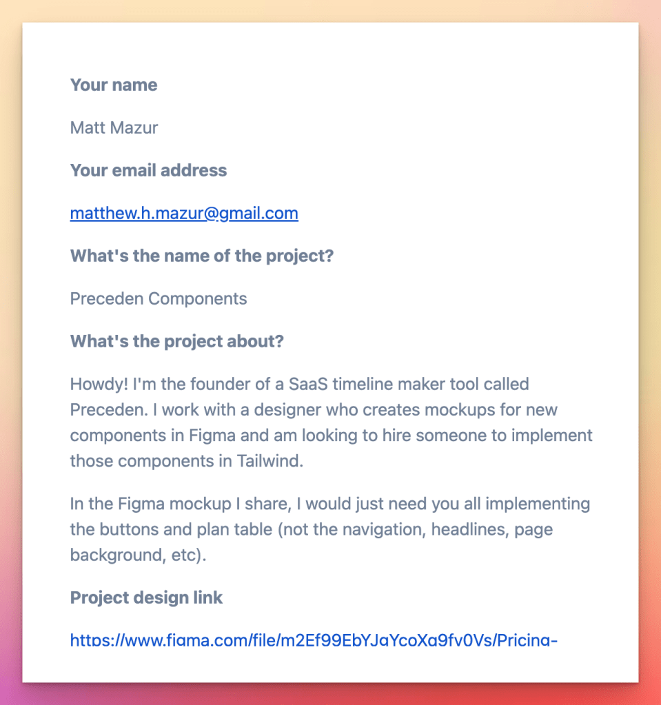 Vivian, the founder, sent me a few questions over email to understand the scope: would it require interactivity? Responsiveness? Can we provide the Tailwind config file?