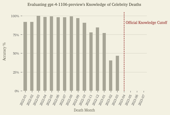 You can find the source code for the USA Today scraper in this celebrity-deaths-scraper repo and the full source code for the Jupyter Notebook used in this analysis in this llm-knowledge-cutoff repo. While this analysis focuses on GPT-4 Turbo, the notebook is easy enough to customize for other ChatGPT models or other LLMs for anyone interested in continuing this work.