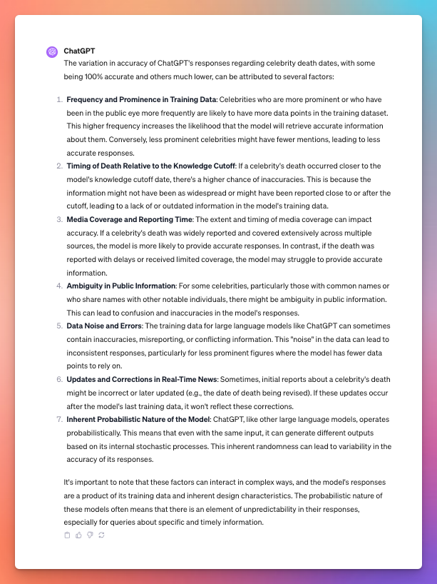 Again, the probabilistic nature of LLMs means that there is inherent randomness in its responses. But why does it return 100% correct responses for some celebrities, 5-10% for others, and 0% for yet others? What about its training makes that happen? I asked GPT-4 Turbo and here is its response which I suspect answers it well: