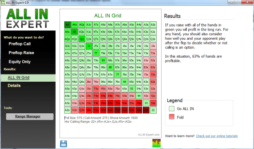 ALL IN Expert is a poker software tool that lets you make better all in decisions in no limit hold’em by showing you exactly the right times when to go all in given specific ranges and stack sizes.