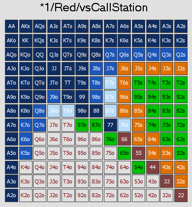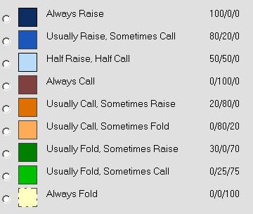 In the example below, orange represents call, maroon a 3x raise, cyan push, and gray/pink fold: