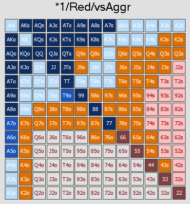 Here’s an example of what the range looks like for the small blind opening range vs an aggressive opponent when the stack size was in the red zone (15 – 22 bb):
